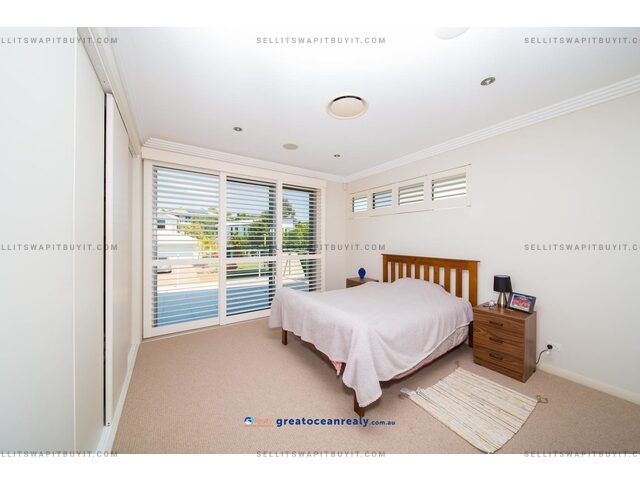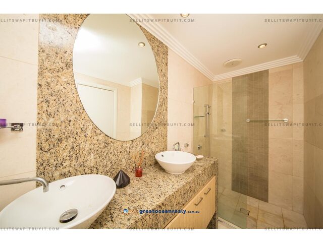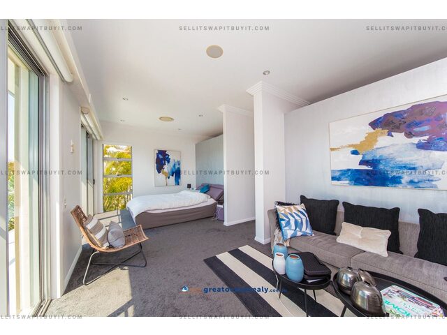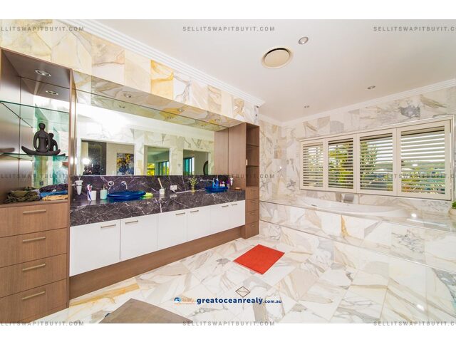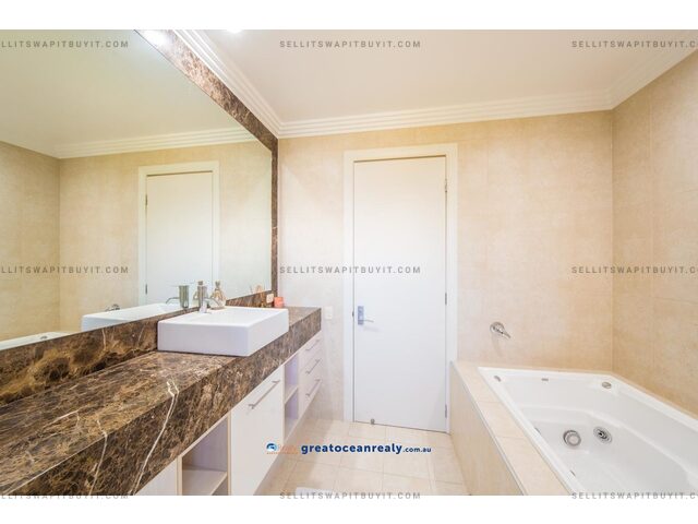 Super King size master bedroom full of natural light, her and his walk-in-wardrobe, fully (marble) tiled ensutes with heated spa, frost glass sectioned toilet and shower room, double vanity with a marble bench top and splashback, views of the open water, through the master bedroom is the north facing super size balcony overlooking the open water
