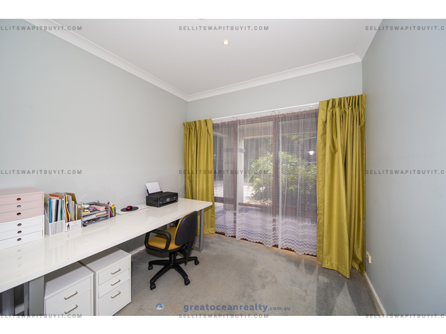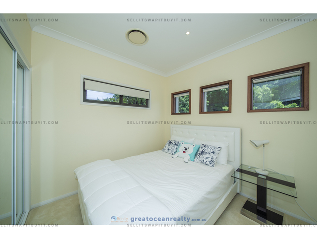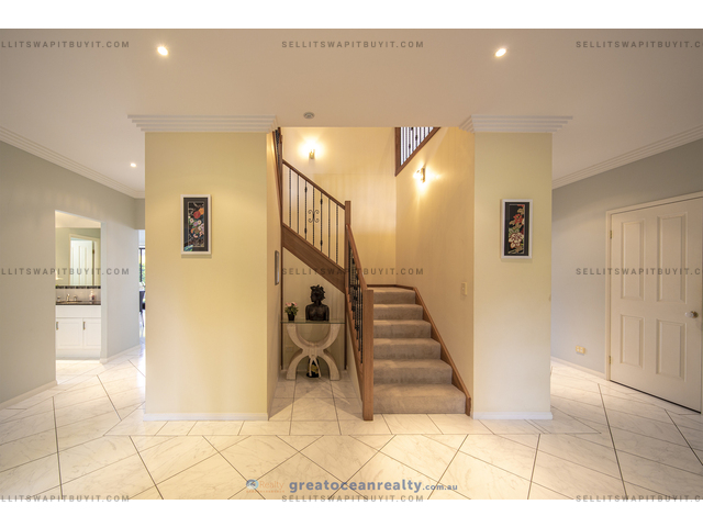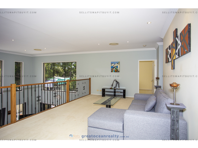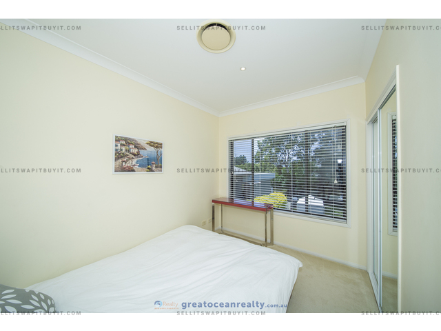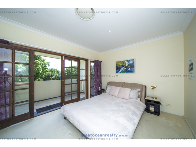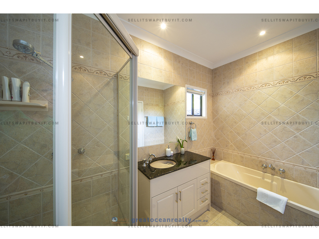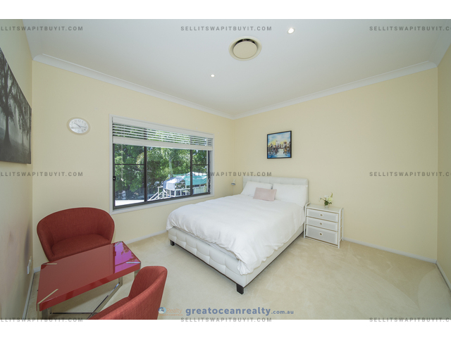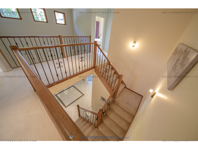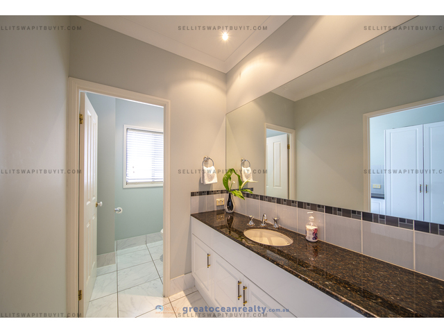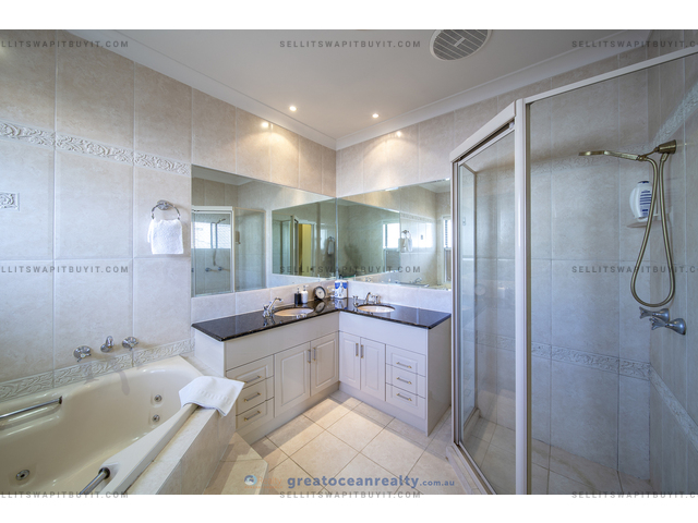 The house has 5 bedrooms, four bedrooms upper stairs, one bedroom downstairs for guest / grandparents. There are two bathrooms upper stairs, one powder room downstairs, the family bathroom has shower and spa bath. The master bedroom has ensuite and walk-in-robe, a large balcony with views of the lake.