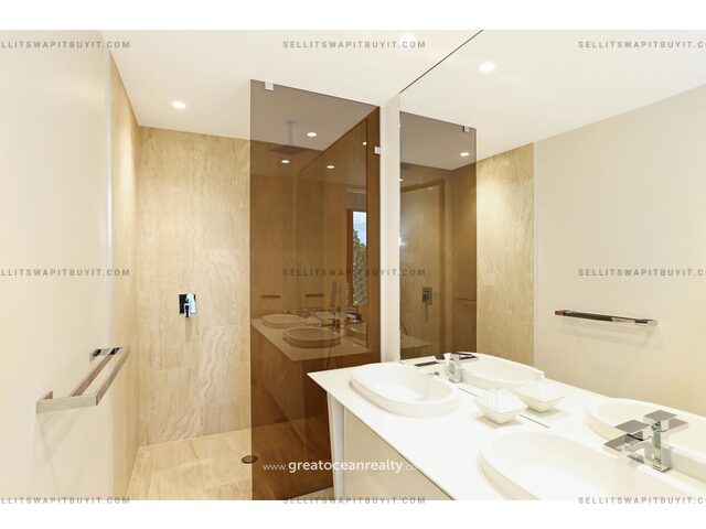 > Stone vanities and floor to ceiling expensive Travertine tiles in both bathrooms
