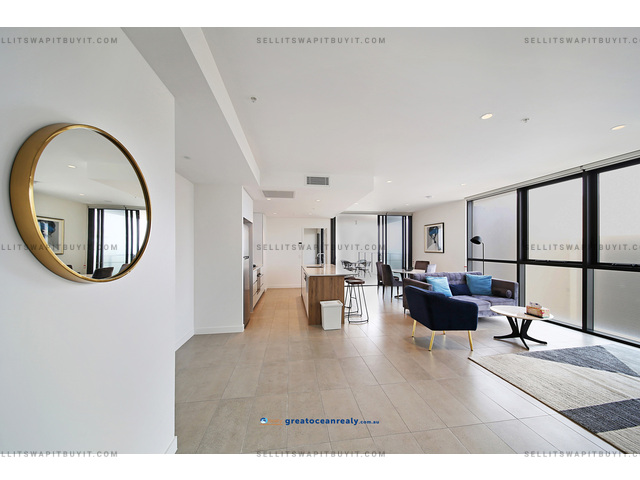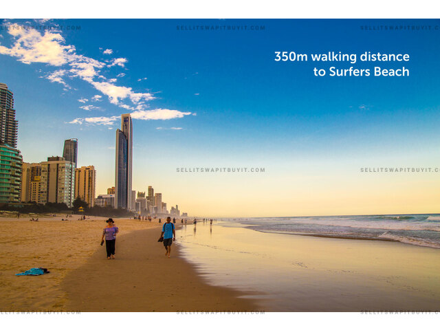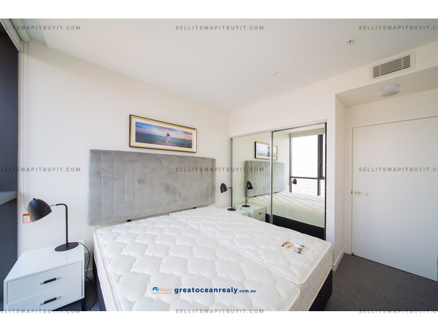 If you love the beach and surfing, you must come to see this luxury two bedrooms, two bathrooms (master has ensuite) apartment right in front of the Surfers Paradise beach. Walk out the building is the golden sandy beach, you would enjoy the fantastic facilities in the building, the state of art Gym with views of the Pacific Ocean, the theatre room, the meeting room, the Sauna, and the infinity pool right on the beach. This is a big unit with two queen size bedrooms, the open plan living area has two separate area, one for the formal lounge and another dinning area. The modern kitchen has island kitchen benchtop, German brand Bosch appliances, gas cooktop, though the last glass sliding door is the balcony with views of Pacific Ocean. The master bedroom has walk-in-robe and ensuite.