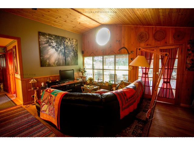 The cabin is also connected to the generous solar power system that this property has in place. Like the main residence it has a flush toilet that goes into an effective worm composting system .
