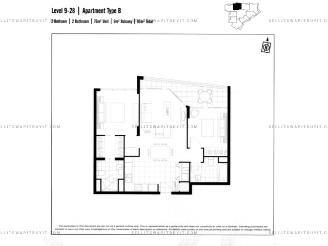 • 85m2 total, 76m2 inside the unit and 9m2 balcony